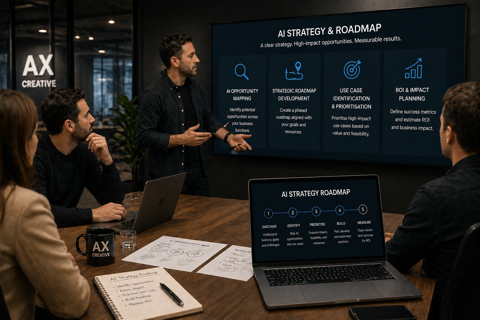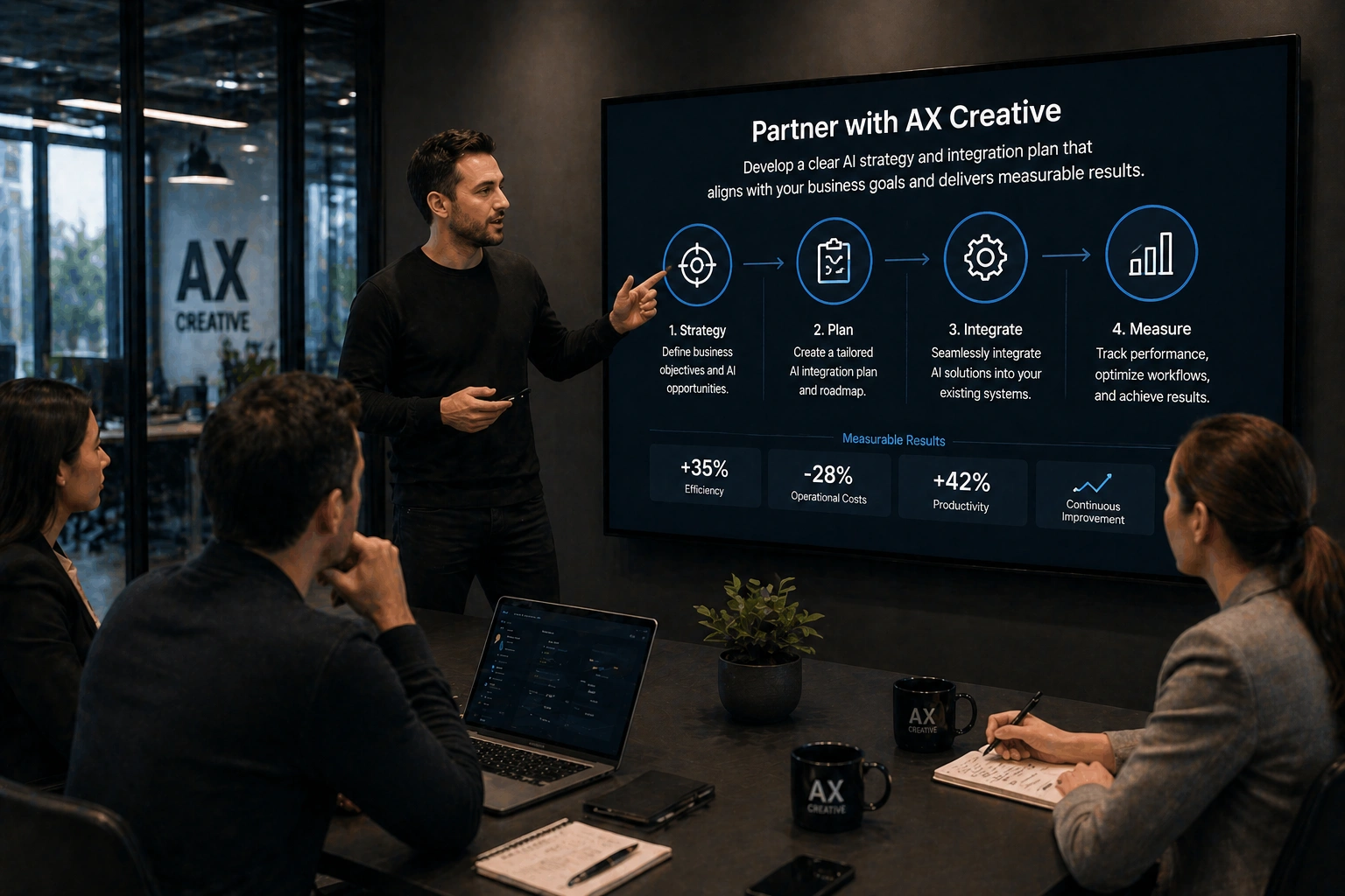 Partner with AX Creative to develop a clear AI strategy and integration plan that aligns with your business goals and delivers measurable results.